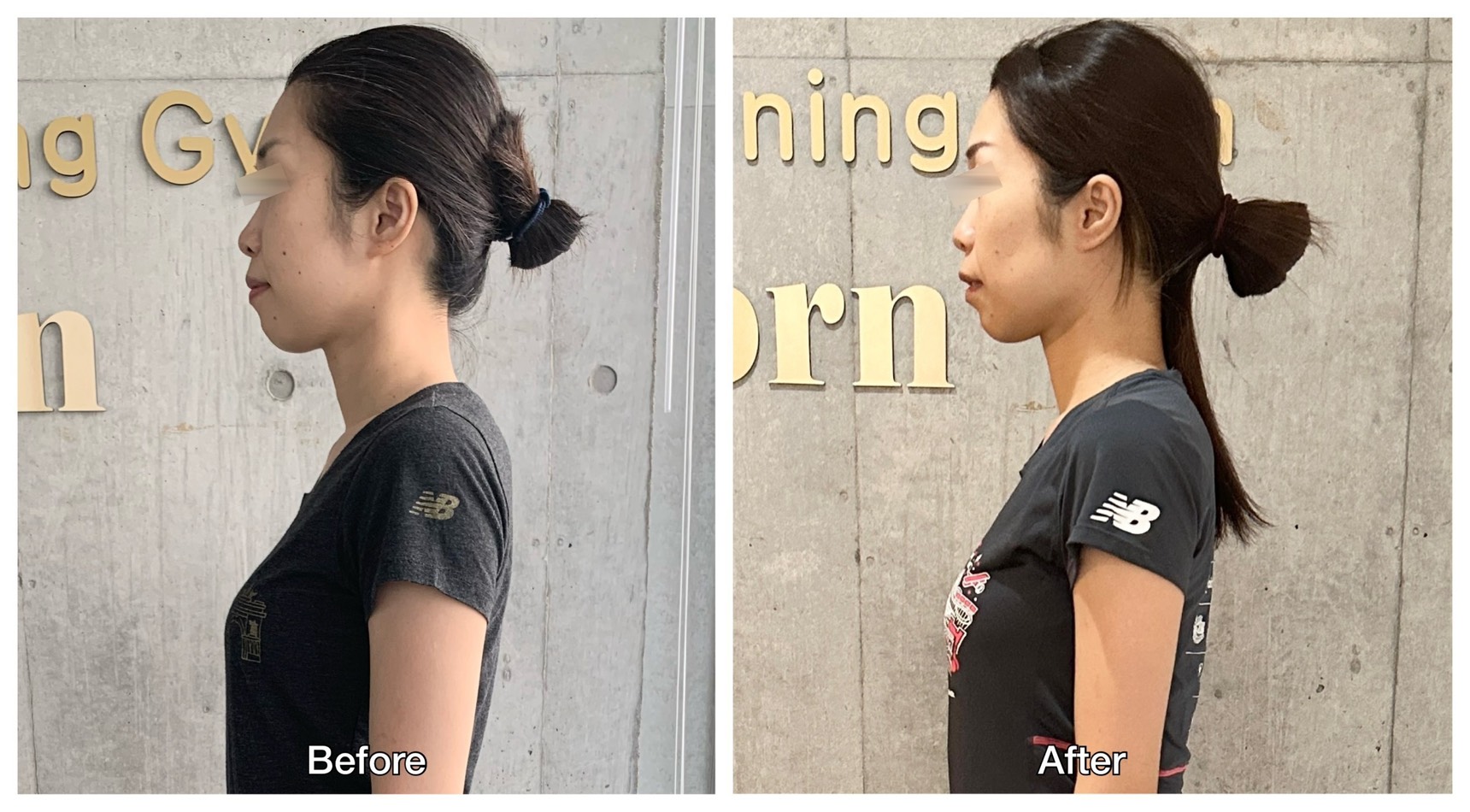 頭が後方に引きやすくなったことで顎が自然に引け、背筋が伸び、姿勢が美しく整いました。頬まわりのむくみも軽減し、フェイスラインがよりシャープに。