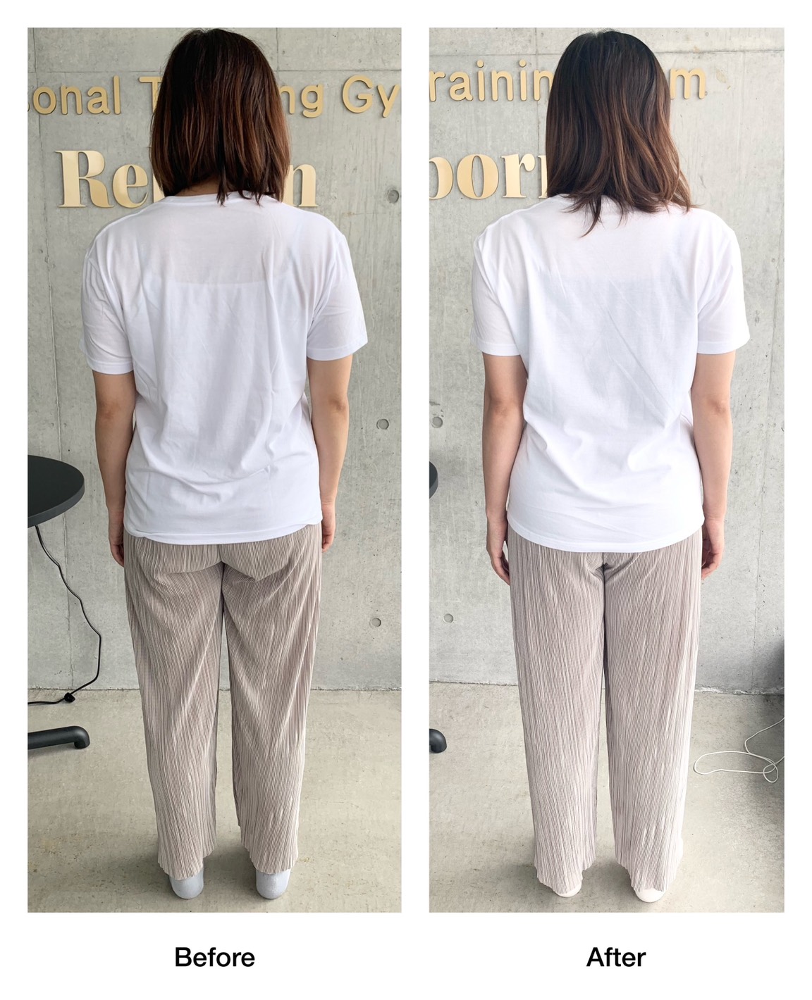 骨盤の高さも揃い、肩の左右差が軽減。ヒップの位置が上がり、脚のラインがすっきりと長く見える印象に。