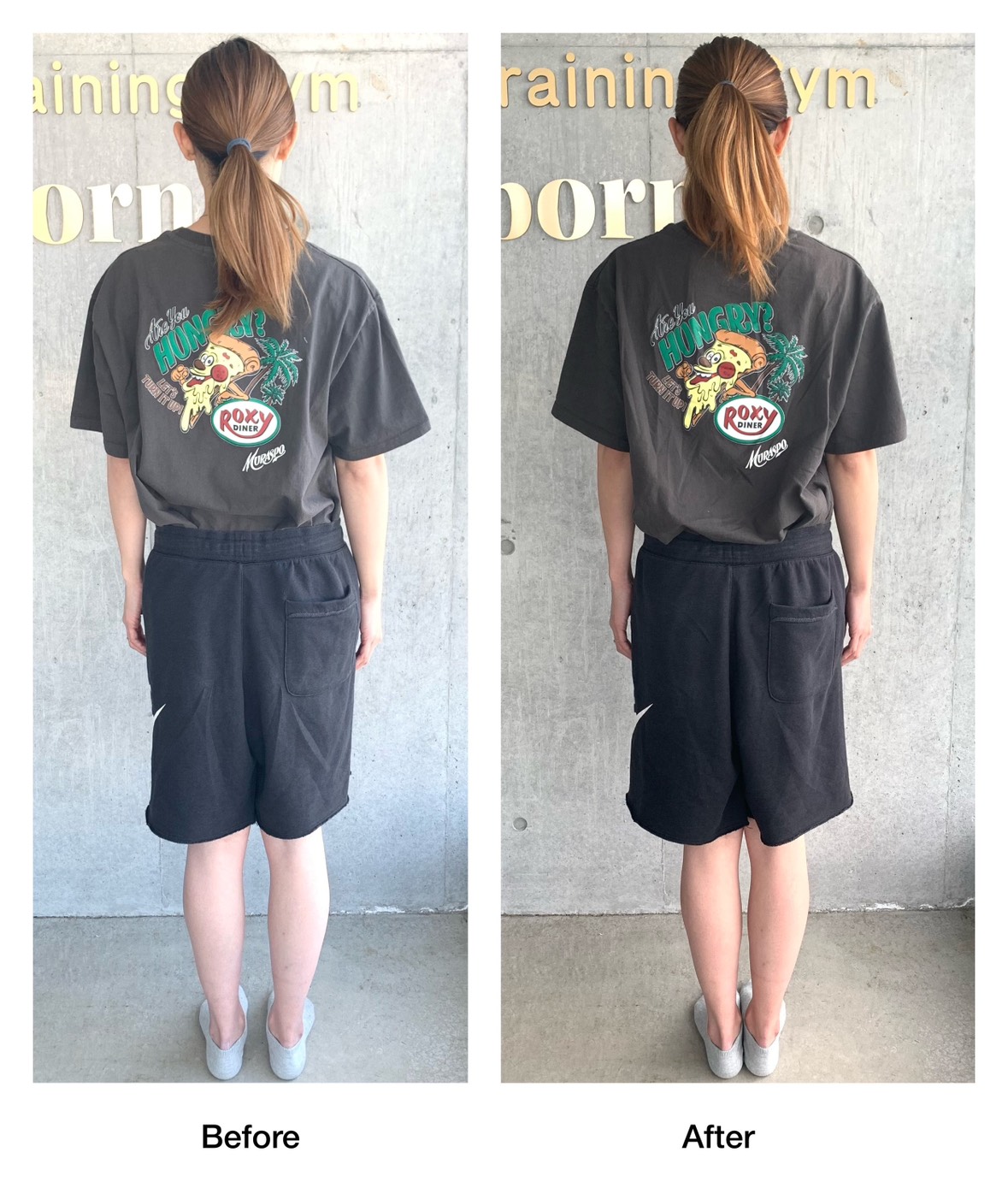 結果として、脚がすっきり見え、立ち姿も軽やかでバランスの良い印象に変化しています。