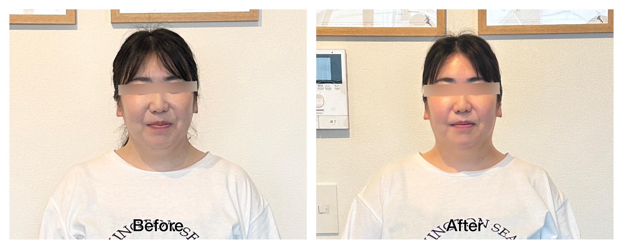 頭部が後方に引きやすくなることで、肩の盛り上がりが改善され、頸部が長く見え、肩首周囲の筋緊張も緩和されました。頬・口元・下顎の筋緊張が解消され、表情も柔らかく整っています。